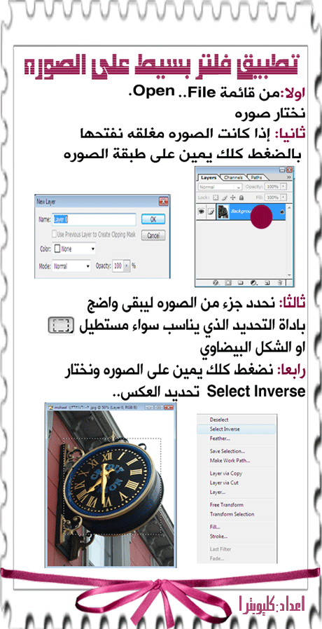 ![]() ![]() الدرس الثاني من الاساسيات شرح القوائم ![]() قائمة File New - جديد يفتح هذا الأمر مربع حوارملف جديد ... و يستخدم عند إنشاء تصميم جديد Open - فتح يفتح هذا الأمر مربع استعراض للجهاز ... يمكّنك من فتح أي صورة على الفوتوشوب Open As فتح كنوع يحدد هذا الأمر امتداد الصورة التي تريد فتحها Close - اقفال يغلق هذا الأمر الصورة الموجودة في أرض العمل Save يقوم هذا الأمر بحفظ الصورة بعد إجراء التعديل عليها save as يتيح هذا الأمر حفظ الصورة باسم.. يمكّنك هذا الأمر حفظ نسخة من التصميم على امتدادات مختلفة Revert - النسخه السابقه يستخدم ها الأمر إذا قمت بتغيرات على الملف و لم تحفظها و ترغب بالعودة إلى آخر نسخة محفوظة Place - وضع يتيح هذا الأمر إدراج صورة على التصميم في طبقة جديدة Import - جلب يقوم هذا الأمر بفتح الملفات المحفوظة في التنسيقات التي تستخدم وحدات استيراد التوصيل و يحتوي على أمر التحرير السريع Export - نقل يقوم هذا الأمر بتصدير الملفات إل تنسيقات مختلفة بإستخدام بمجيات مختلفة Automate - آلي يتيح هذا الأمر بعض إمكانيات المعالحة الدفعية File Info - معلومات يقدم هذا الأمر بعض المعلومات عن الصورة أو التصميم من مقاسات و إحداثيات Page Setup - إعداد الطباعه يقدم هذا الأمر بعض المعلومات و الخيارات قبل طباعة الصورة Print الطباعة Preferences يتيح هذا الأمر خيارات متعددة التي تساعد على تسهيل استخدام الفوتوشوب للمستخد Color Settings يحتوي هذا الأمر على خيارات تعديل ألوان العرض و ألوان الطابعة Adobe O يعرض هذا الأمر المعلومات المعدلة ديناميكيا عن الفوتوشوب (يجب الإتصال بالإنترنت) لاستخدام هذا الأمر Exit هذا الأمر يقوم بإغلاق الفوتوشوب ![]() ![]() قائمة Edit - تحرير undo - التراجع step forward- التقدم خطوة step backward- التراجع خطوة cut - قص يزيل هذا الأمر المنطقة المحددة و يحفظها في الذاكرة copy -نسخ ينسخ هذا الأمر المنطقة المحددة و يحفظها في الذاكرة copy merged - نسخ مدموج ينسخ هذا الأمر منطقة محددة من كل الطبقات المرئية paste - لصق يلصق هذا الامر ما تم حفظه في الذاكرة paste into - لصق في الداخل يلصق هذا الأمر منطقة محددة ضمن منطقة نشطة (يعني منطقة محددة) ثم يقوم الفوتوشوب بتحويل التحديد إلى layer mask clear - مسح يحذف هذا الأمر المنطقة المحددة check spelling - التاكد من الاملاء يستخدم في تصحيح الأخطاء الإملائية fina & replace - بحث واستبدال وظيفته البحث و الاستبدال لكلمة معينة fill - تعبئه يستخدم هذا الأمر لملئ منطقة محددة أو الطبقة بلون معين stroke - حد ينشئ هذا الامر حدود بعرض معين حول منطقة محددة frea transform - تحويل حر يتيح لك هذا الأمر بتحريك الصورة أو جزء منها (قلب ، تدوير ، تشويه ، إمالة) transform - تحويل يشبه اللي فوقه بس بدرجات معينة define brush - تحديد فرشاه تستطيع إنشاء فرشتك الخاصة من خلال هذا الامر define pattern - تحديد الحشو تستطيع إنشاء خلفيتك الخاصة مثال : ( تكرار الكلمة في الخلفية) define custem shape - تحديد شكل شخصي تستطيع إنشاء أشكال جاهزة مثال : ( كرة ، مستطيل ، أي شكل تبغى) purge - تنظيف color setting - خصائص الالوان preset manager - مدير الاعدادات المسبقه preferences - تفضيلات ![]() ![]() قائمة Image صوره mode - صيغه تستطيع من خلال هذا الأمر استخدام أنماط مختلفة من الألوان وتغير صيغ الصوره للإظهار و الطباعة و الحفظ ، و النمط RGB هو النمط الإفتراضي و الأكثر استخداماً adjust - ضوابط يظهر هذا الأمر قائمة جزئية فيها مجموعة من الخيارات ... للقيام بالتعديلات اللونية duplicate - مضاعفة يقوم هذا الأمر بمضاعفة التصميم إما في طبقة واحدة أو في عدد من الطبقات apply image - تطبيق صوره يستخدم هذا الأمر لتطبيق قنوات وحيدة أو مركبة على الطبقة المحددة و يستخدم بشكل رئيسي لمزج الصور calculations - عمليات مثل اللي فوقه و لكن يفتح لك مربع حوار الحسابات و الذي يسمح لك باستخدان مستند مصدر للمزج في أي منهما iamge size - حجم الصوره أحد الأوامر الأكثر أهمية للتحكم في حجم الصورة canvas size - حجم العمل يستخدم لتغير ارتفاع او عرض الصورة دون أن تتغير الصورة أو الدقة (الوضوح) rotate canvas - تدوير حقل العمل يستخدم هذا الأمر ف