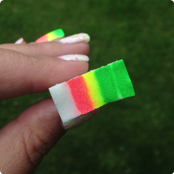 - الخطوة الثانية: ضعي طلاء الاظافر مثلا الابيض على كل اظافرك، ثم ضعي خطوط من الوان الابيض والرملي والنيون على اسفنجة المكياج.