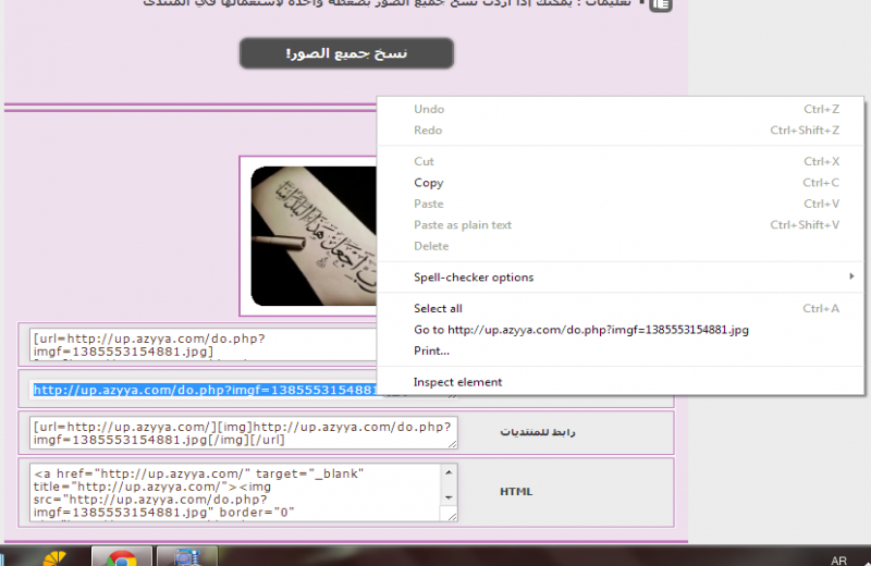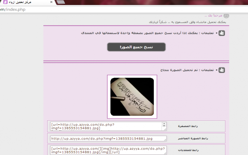 1 . في أعلي منتدي تلقين (مركز تحميل الصُور ) اضغطي عليه https://up.azyya.com/do.php?imgf=1385560798916.png 2. يفتحلك رابط ثاني . https://up.azyya.com/do.php?imgf=1385560797451.png 3. اضغطي علي (choose file ) ينفتحلك الملفآت تبعك ,اختاري الصُورة الي تبيها واضغطي علي (رَفع الملفآت ) . https://up.azyya.com/do.php?imgf=1385560797772.png 4 . بعد ماتم رفع الملف راح يظهرلك زي الي في الصُورة تحت . https://up.azyya.com/do.php?imgf=1385560798494.png 5 . سوي (copy ) لـ رابط الصورة المباشر . https://up.azyya.com/do.php?imgf=1385560798113.png 6 .سَوي له( past ) في المشآركة الي تبينها https://up.azyya.com/do.php?imgf=1385560798855.png وخلاص =$ أَتمني تكُوني فهمتي موفقة https://forums.graaam.com/images/smil...am%20(276).gif |