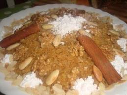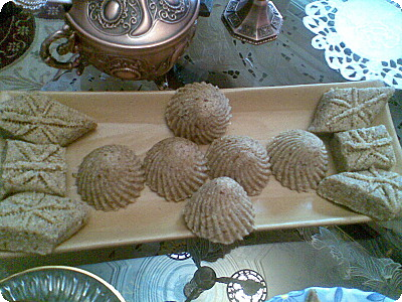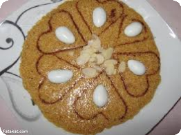 كلغ سميد 1كلغ زبدة مذابة ماء وماء الزهر كأس لوز أو الفول السوداني أو فستق قليل من الملح عسل حليب رائب أو لبن ماء الزهر زبدة سكر ناعم طريقة العمل نخلط السميد الزيت والزبدة نمزجهم جيدا ثم نضيف الملح ونبللهم بالتدريج بماء الزهر والماء ثم نأخد صينية وندهنها جيدا بالزبدة نضع العجين ونبسطها في الصينية ونقسمها الى مربعات نضعها في الفرن مدة 25د حتى تطهى وتحمر نخرجها من الفرن ونقوم بهرس عجين الرفيس المطهو وهو ساخن نغربلها ونفتلها بكف اليد مع صب ماء الزهر ونتركها تفورة مرة اولى وعندما يفور ننزعه ونضعها في قصعة(صينية كبيرة ) ونرش عليها ماء الزهر و القليل من حليب ونرجعها تفور مرة اخرى ونضعها في القصعة ونضيف لها الزبدة والعسل ونتركها لبضع دقائق ثم نضعها في صحن التقديم http://up.azyya.com/do.php?imgf=1366875790491.jpg ونزينه بالسكر الناعم و الفول السوداني أو اللوز او الفستق وتأكل مع اللبن أو الحليب الرائب طمينة تمر او الرفيسة http://up.azyya.com/do.php?imgf=136687605762.jpg المقادير تمر منزوع النوى دقيق متوسطالحجم زبدة أو السمن قليل من الملح الطريقة في مقلاة أو ( طاجين الطين ) ضعي الدقيق وابدي فيتقليته أو شويه بملعقة من الخشب واستمري في التحريك والتقليب إلي أن يصبح لونهذهبي نسبيا قبل أن تتأكدي من نضجه تماما ضعي عليه التمر حتى تتحققي من التمر أنه صار ساخنا ليسهل عجنه مع الدقيق بعد ذلك . ضعي الخليط في إناء يتيح لك العجن بسهولة كالقصعة مثلا مع إضافة قليل من الملح استمري بالعجن حتى يبدأ الخليط بالتماسك تضاف بعد ذلك الزبدة أو السمن "الدهان كما يسمى عندنا" على مراحل أحسن ويستمر العجن إلى أن تتأكدي من تماسك الخليط كالعجينة يسوى على سطح الإناء كما يسوى الخبز "الكسرة" حيث تقدم على شكل قرص أو تقطع بالسكين أو أداة حادة إلى شرائح وتوضع في صحن أو طبق للأكل يصحبها أحيانا اللبن "الحليب" طمينة جزائرية •المقادير: رطل دقيق خشن - ملعقة كبيرة زبدة - كوب كبير سكر - ماء للتزيين - ملعقة صغيرة قرفة - كوكاو ( الفول السوداني ) مفروم أو فستق مبشور أو لوز……. طريقة التحضير: أولا: في مقلاة نحمص الدقيق . ثانيا: في كسرولة نضع السكر ونخلطه حتى يذوب ،ثم نضع عليه3 أكواب ماء من نفس المقياس الذي وضعنا به السكر، و نتركه حتى يعقد ونضع فية الزبدة إلى أن تذوب. ثالثا: نخلط الدقيق مع الخليط المتحصل عليه. http://up.azyya.com/do.php?imgf=1366876057551.png طمينة او الزرير او بسيسة مكونات: 200 غرام سميد. 100 غرام زبدة. 70 غرام عسل. قرفة. كيفية طمينة او الزرير او بسيسة حمصي السميد على نار هادئة باستعمال ملعقة من خشب مع التحريك المستمر. ذوبي الزبدة و العسل على نار هادئة. بعدها ضيفي السميد مع خليط العسل و اخلطي جيدا. افرغي الطمينة في صحن ثم زينيها بالقرفة http://up.azyya.com/do.php?imgf=1366876450621.png بغرير او الغرايف او الفطاير مكونات تحضير بغرير قبائلي: 700 غ سميد. 700 غ فرينة. 6 حبات بيض. 6 ملاعق كبيرة بودرة الحليب. 4 ملاعق كبيرة زيت. 4 ملاعق كبيرة خميرة البيرة. مبشور ليمون. ملح. 1 كأس كبير ماء دافىء. 15 غ زبدة. مربى أو عسل. http://up.azyya.com/do.php?imgf=1366876609731.jpg كيفية بغرير قبائلي: اخلطي كل المقادير مع بعض لتتحصلي على عجينة سائلة. اتركي العجينة تتخمر لمدة 80 دقيقة. ادهني الطاجين بالزبدة و اطهي البغرير واحدة تلوى الأخرى. زيني البغرير بالعسل أو المربى. خشخاش الخشخاش الجزائري ــــــــــــــــــــــــــ ــــــــــــــــ http://up.azyya.com/do.php?imgf=1366876912811.png المقادير: ـــــــــــــــ 250غ طحين 60غ زبدة دائبة 2-معالق سكر 1-خميرة حلويات ماء بيضة رشة ملح زيت للقلي عسل ــــــــــــــــ الطريقة: نأخد كل اللوازم ونخلطها مع بعض حتى نشكل عجينة ليينة نقسمها دوائر ونتركها ترتاح ثم نمددها حتى تصبح شفافة ونلويها على بعضها ثم نقطعها معينات ثم نقليها في زيت ساخن وبعد ما تبرد نعسلها سفنج [/COLOR مكونات تحضير سفنج جزائري: 1 ملعقة كبيرة زبدة. 2 حبات بيض. 1 كأس حليب. 1 كأس و نصف دقيق. 1 كأس كوكاو أو لوز. 1 كيس خميرة كيميائية. ملح. 1 كيس فانيلا. زيت للقلي. شراب السكر. http://up.azyya.com/do.php?imgf=1366877075651.jpg