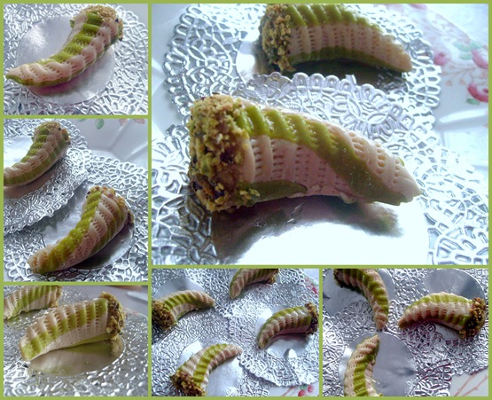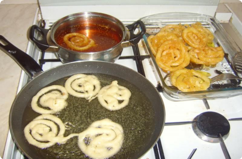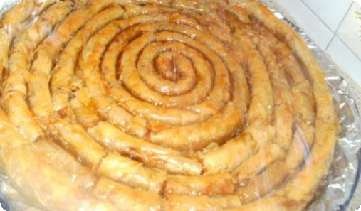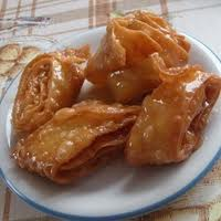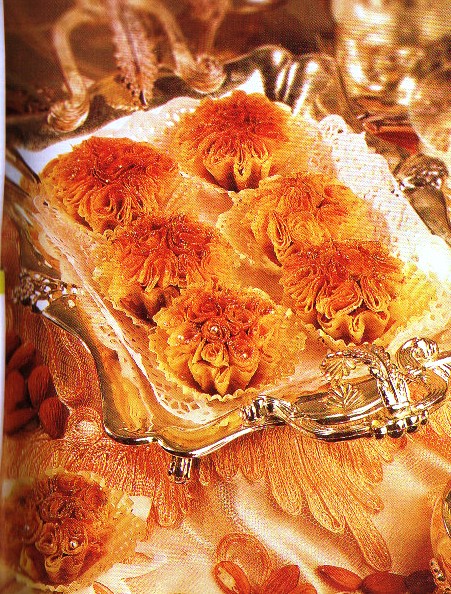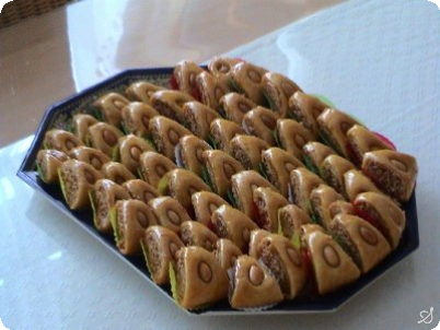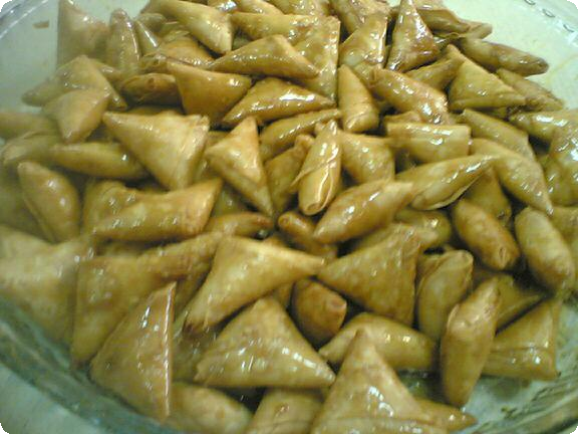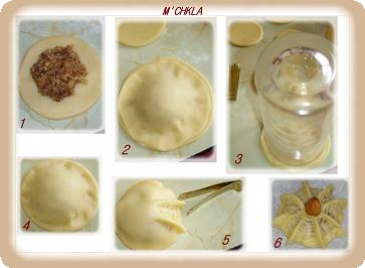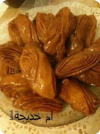 السميد الملح الماء للطياب نحتاج أيضا: الزيت و طاجين الحديد (المدلى) التزيين: الزبدة العسل الجوز عصير البرتقال قومي بتحضير العجينة مثل عجينة المحاجب ثم اطهيهيا بعدما تطيبيهم قطعيهم و يستحسن في هده الوصفة تتقطع بالسكين شرائط شرائط قومي باضافة العسل و الزبدة لي دوبتيهم على الشرائط http://up.azyya.com/do.php?imgf=1366965044891.jpg http://up.azyya.com/do.php?imgf=1366965045472.jpg http://up.azyya.com/do.php?imgf=1366965045713.jpg http://up.azyya.com/do.php?imgf=1366965046094.jpg http://up.azyya.com/do.php?imgf=1366965046475.jpg محنشة المقادير كوب من اللوز المسلوق والمقشر كوبان وثلاثة ارباع الكوب من اللوز المطحون نصف كوب من السكر نصف كوب من الزبده الطريه+20غ من الزبده لقلي اللوز ملعقه صغيره او ملعقتان من القرفه المطحونه ملعقة طعام من ماء الزهر عجينة مورقة جاهزة صفار بيضه واحده للطبقه العلوية سكر ناعم, قرفه مطحونه التحضير يقلى اللوز المسلوق والمقشر في القليل من الزبده حتى يصبح بنيا ذهبيا. ثم يطحن من مطحنه ليصبح شبيها بفتات الخبز الخشن. يوضع اللوز في وعاء ويضاف اليه اللوز المطحون والسكر الناعم والسكر العادي والزبده والقرفه وماء الزهر. تستعمل اليدان لخلط المزيج وتحويله الى عجينه طريه. يغطى المزيج ويحفظ في الثلاجة لمدة 30 دقيقه تقريبا. يحمى الفرن الى حرارة 180 درجه مئويه. تؤخذ كتل من عجينة اللوز وتلف على شكل اصابع. يوضع كل اصبع من عجينة اللوز بمحاذاة الحافه الطويلة للطبقه العلويه من العجينة المورقة, ثم تلف الرقاقة على شكل لفافه بسماكة الابهام. يقحم طرفا اللفافه جيدا للحؤول دون خروج الحشوه. تكرر العملية نفسها مع باقي العجينة، الى حين استعمال كل الحشوه. تؤحذ اول عجينه, وتفتل جيدا وتوضع وسط صينيه كبيره مدهونه بالزبده. تكرر العملية نفسها مع لفافات العجينه الاخرى. بحيث تفتل قليلا وتوضع بالقرب من بعضها البعض على شكل دائري. يخلط صفار البيضه مع القليل من الماء ويدهن سطح لفافات الهجينه بهذا الصفار. تخبز اللفافات لمدة 30 الى 35 دقيقة الى ان تصبح هشه وبنيه قليلا. يرش فوقها السكر الناعم ومسحوق القرفه http://up.azyya.com/do.php?imgf=1366965743421.jpg زلابية المقادير ............. 1 كوب طحين 1 كوب نشاء 1 و ربع كوب ماء 1 ملعقة كوب خميرة و زيت للقلي و طبعا مقلات غليظة ((ما يعادل 3 كوب سكر و 1 كوب ماء..و الا ستلين الزلابية )) و نضيف ماء ورد و زعفران و هيل مطحون للشيرة الطريقة ............. نخلط كل المواد ما عدا الشيرة طبعا و نتركها لترتاح و تاخذ الخميرة مفعولها حوالي ساعة..مع التحريك المستمر كل ربع ساعة تقريبا لاخماد الخليط و كي لا يكون داخله فقاعات . .http://up.azyya.com/do.php?imgf=1366966695181.jpg بعدها نصب الخليط ((او جزء منه)) في كيس حلواني ((الافضل استخدام علبة كتشب او مايونيز فارغة ذات رأس مدبب ..بعد غسلها جيدا طبعا)) و نصب من الخليط في زيت حار غزير ..على شكل زلابية طبعا المسالة معقدة و صعبة و تحتاج الى مهارة و خبرة ما ان نخرج كل قطعة من الزيت نضعها مباشرة في الشيرة و الافضل ترتيب الاواني كما هو في الصورة و الافضل بعد الاستعانة بمن يساعدكم ,,ان وُجد !! بعدها نخرجها من الشيرة..و نرص القطع في صحن التقديم http://up.azyya.com/do.php?imgf=1366966695181.jpg صامصة المقادير: 1كلغ لوز-250 غ سكر رقيق- 1/2 كوب ماء زهر-3 بيض-150 غ زبدة ذائبة--م.ص.قرفة -1 كلغ من ورق الديول-لتر عسل-زيت للقلي. الطريقة: يقشر اللوز و يطحن.يخلط مع السكر ويعاد طحنه ثم يضاف اليه ربع كوب ماء الزهر و50 غ الزبدة المذابة, ثم نضيف 3 ابيض اليض للحصول على عقدة لينة و تماسكة ثم تقسم الى كويرات بحجم اامشمشة وتطلى الورقة بقليل منىالزبدة;توضع العقدة في حاشية الورقة وتطوى بلف العقدة بالورقة على شكل مستطيل او مثلث ويلصق الطرف الاخر باصفر البيض . تقلى في الزيت من الجهتين حتى يتورد لونها ثم تغمس في العسل الدافئ وبالصحة والراحة http://up.azyya.com/do.php?imgf=1366967012311.jpg |