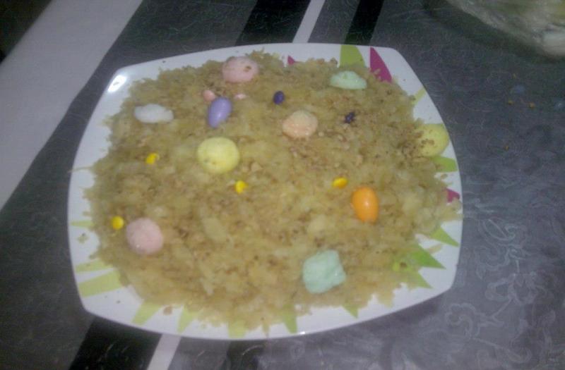 المكونات 2 أكواب سميد. كوب حليب. 4 حبات بيض. 2 ملاعق كبيرة زيت. كيس خميرة كميائية. قرصة ملح. زيت للقلي. طريقة التحضير اخلطي السميد مع 2 ملاعق زيت. ضيفي البيض،الحليب البارد،الملح و الخميرة. سخني الزيت جيدا ثم اسكبي الخليط. اقلبي المشوشة من الجهة الثانية ثم قطعيها الى 6 قطع. ضعيها في صحن التقديم و اسكبي فوقها العسل الذائب http://up.azyya.com/do.php?imgf=1367156772751.jpg |