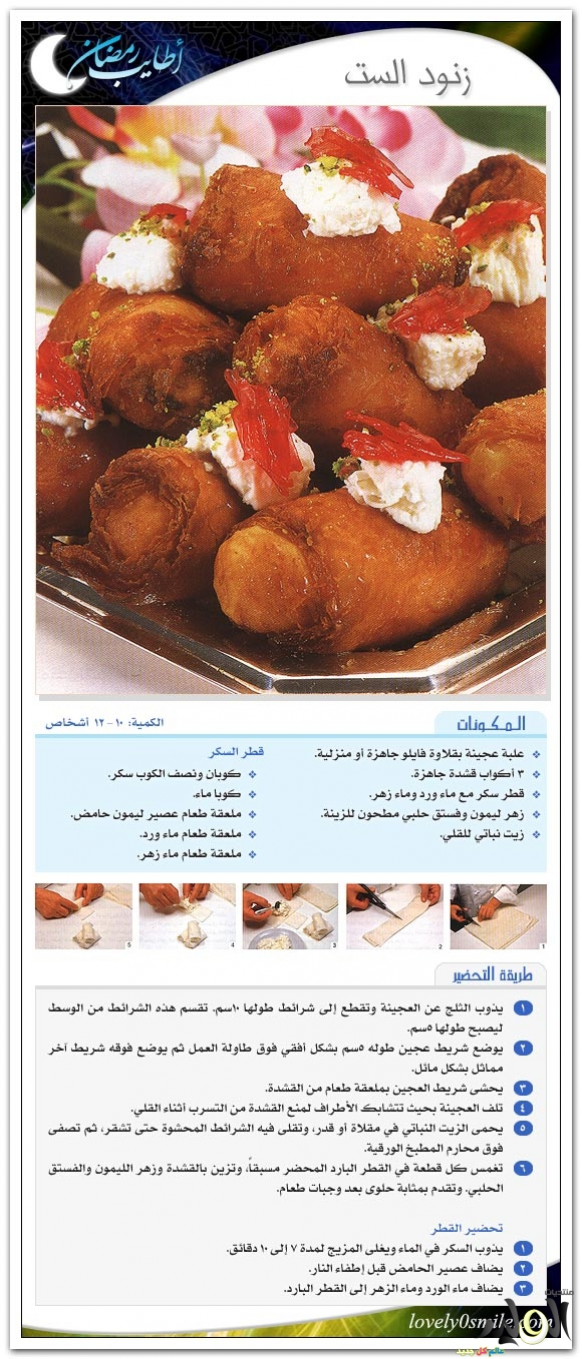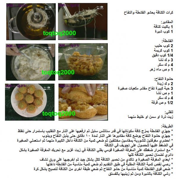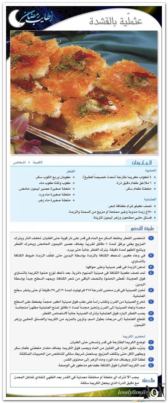 http://up.azyya.com/do.php?imgf=1367249553272.jpg http://up.azyya.com/do.php?imgf=1367249553423.jpg http://up.azyya.com/do.php?imgf=1367249553574.jpg http://up.azyya.com/do.php?imgf=1367249553675.jpg http://up.azyya.com/do.php?imgf=1367249553826.jpg http://up.azyya.com/do.php?imgf=1367249781651.jpg كنافة ملفوفة بالمكسراتأطباق رئيسية المكوّنات و المقادير 1 كيلو كنافة شعر طازجة 2 كوب مكسرات ( فستق أو بندق) 3 كوب سمن سائل قطر (شربات) للشربات 4 كوب سكر 1 كوب ماء 1 ملعقة صغيرة عصير ليمون طريقة الشربات • يوضع السكر في وعاء ويضاف إليه الماء وعصير الليمون ويرفع على نار متوسطة الحرارة. • يحرك الخليط جيدا حتى يذوب السكر ويصير الخليط كثيفا. طريقة التحضير - تُفرد خصلات الكنافة على الطاولة بطريقة مستوية على هيئة شرائط طويلة بعرض 8 سنتيمتر. - تُوضع المكسرات في الوسط في خط مستقيم . - تُبرم الكنافة و تُلف مع الضغط عليها لتكون أسطوانات طويلة بقطر حوالي 4 سنتيمتر. - تُوضع في صينية فرن و تُسقى بالسمن حتى تغطيها. - تُخبز في فرن حرارته 150 درجة مئوية لمدة نصف ساعة ثم تُقلب على الوجه الأخر داخل الفرن لمدة نصف ساعة أخري. - تُصفى من السمن وتُسقى بالشربات الثقيل حتى يغطيها وتترك مغموسة في الشربات لمدة 12 ساعة. - تدفأ قليلا في الفرن على درجة حرارة 140 مئوية ليسهل تصفية الشربات الزائد منها. - تُصفى من الشربات ثم تُقطع وتُقدم . * يمكن حرق القليل من السكر لعمل كراميل يضاف إلى الشربات ليُكسبه لوناً ذهبياً مميزاً للكنافة الملفوفة. http://up.azyya.com/do.php?imgf=13672500681.jpg نمورة باللبنالمطبخ الحلب المكوّنات و المقادير 5 أكواب سميد كوب طحين كوب لوز مقشر 2 كوب زبدة أو سمنة كوب سكر ناعم 2 كوب ونصف لبن 2 ملعقة صغيرة بكينج باودر 3 ملاعق كبيرة طحينة لدهن الصينية 3 أكواب قطر " شيرة " طريقة التحضير يخلط السميد مع الطحين والبكينج بودر والزبدة والسكر واللبن للحصول على عجينة لينة تدهن جوانب وأسفل الصينية بالطحينة لعدم التصاق العجينة يوضع العجينة في الصينية وتزين بحبات اللوز ويترك جانباً ليرتاح مدة 5- 6 ساعات قبل الخبز تخبز النمورة في فرن درجة حرارته 375 – 400 فرنهايت ( 190 – 200 درجة مئوية ) مدة 30 دقيقة تقريباً حتى يتلون سطحها باللون الوريد تخرج الصينية من الفرن وترش النمورة المخبوزة بالقطر البارد تقطع النمورة إلى مربعات وتقدم مع الشاي أو القهوة أو العصير http://up.azyya.com/do.php?imgf=1367249993911.jpg كل وأشكرأطباق المكوّنات و المقادير لعجين الجلاش (البقلاوة) 3/4 3 كوب دقيق 1 بيض 2 ملعقة كبيرة ملح 1/4 1 كوب ماء 2 ملعقة كبيرة زيت 3 كوب نشا (للفرد) لحشو كل وأشكر مكسرات مجروشة مع السكر (حسب الرغبة) 1 كوب سمن سائل شربات (قطر) راقات من عجين الجلاش طريقة التحضير لعجين الجلاش - يُوضع الدقيق والبيض والملح في العجان الكهربائي على سرعة متوسطة، ويُضاف الماء تدريجياً مع الاستمرار في العجن. - يُضاف الزيت، وتُعجن لمدة 10 دقائق حتى نحصل على عجين أملس ومطاطي. - يُغطى العجين ويُترك لمدة 30 دقيقة. - يُقسم العجين إلى قسمين ويُشكل كل جزء على هيئة اسطوانة. - تُقطع كل اسطوانة إلى أقسام متساوية بسُمك 2 سنتيمتر بواسطة سكين حادة، وتُشكل على هيئة دوائر، وتُغطى كل دائرة من الدوائر بالنشا من الجهتين وتُرص فوق بعضها وتُغطى (بفوطة جافة) وتُترك لمدة 10 دقائق. - تُفرد دوائر العجين على سطح أملس مرشوش بقليل من النشا وتُرقق بنشابة طويلة (كل على حدة)، وتُرص الدوائر المفرودة فوق بعضها وتُرش بالنشا حتى لا تلتصق، وتُغطى وتُترك لمدة 30 دقيقة (مع مراعاة التخلص من النشا الزائد حول العجين بفرشاة ناعمة). - تُفرد راقات العجين بالنشابة على سطح مرشوش بقليل من النشا حتى يُصبح سُمكها كالورقة (تُلف الدوائر بحركة نصف دائرية أثناء الفرد). لحشو كل وأشكر - يُدهن صاج بقليل من السمن السائل، تُقطع أوراق الجلاش على هيئة مستطيلات بعرض 6 سنتيمتر، وتُوضع5 طبقات من أوراق الجلاش فوق بعضها، على سطح أملس. - يُوزع حشو المكسرات بحيث يُغطي نصف مساحة الأوراق. - يُطوى الجانب الآخر من الأوراق ليُغطي الحشو، ثم يُقطع بالسكين إلى وحدات صغيرة. - تُرص في صاج فرن وتُرش بالسمن السائل جيداً وتُخبز 