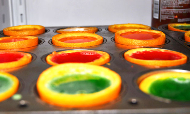 فبعد عصر البرتقال نظفي الجزء الفارغ جيدا وضعيه في القوالب المخصصة للكيك،ثم صبي الجيلى فى قوالب البرتقال، ودعيه يتماسك جيدا في الثلاجة بعدها قسميه من المنتصف بسكينة حادة.