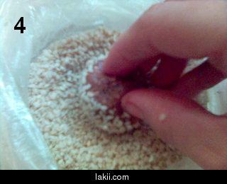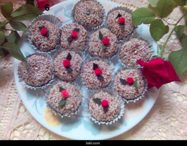 3 أكواب من الفول السوداني محمص و مهرمش (كوب دو حجم متوسط). 2/1 كوب شكلاطة بودرة(Nescuik ). 1 ملعقة ص فانيلا . مبشور ليمونة. 30 غ زبدة . 40 غ من حلوة الترك تفرك باليدين . (حسب علمي في الخليج تدعى حلوى الطحينة أو ما شابه. اليكم الصورةرقم 1 بها علبة النخلة .أتت بها احدى قريباتي حين قامت بالعمرة . عقبالنا إن شاء الله ) 4/1 ملعقة ص من القرفة . كمية من العسل .(لهذا لا نحتاج الى سكر ) يمكن تعويض الشكلاطة ببودرة الكاكاو ، لمن لا يحب الحلاوة كثير. نحتاج للزينة : جلجلان أبيض اللون (أضن انه يدعى بالسمسم البيض ) ورود وأوراق من عجينة اللوز(pâte d’amende ) ، او الحلوى الفضية. الكيفية: في إيناء خاص نخلط كل المواد الجافة جيدا . ثم نضيف العسل بكمية قليلة مع الخلط جيدا ، الى ان نحصل على عجينة متماسكة . نصنع كريات بحجم كبير قليلا من حبة الجوز . http://up.azyya.com/do.php?imgf=1374681505062.jpg نغطس الوجه جيدا في السمسم الأبيض . http://up.azyya.com/do.php?imgf=1374681505021.jpg نضعها في الأوراق الخاصة بالحلوى ، نزينها بوضع وردة ملونة في الوسط مع ورقتين . او بحبة حلوى فضية . http://up.azyya.com/do.php?imgf=1374681505093.jpg |