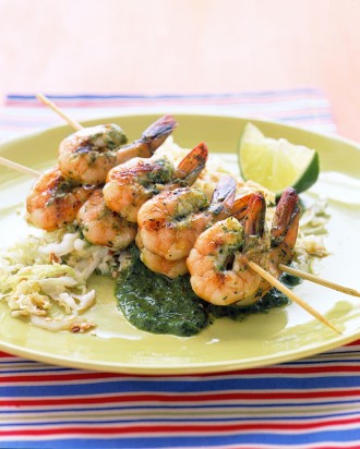 فرشاة أسياخ الروبيان مع صلصة الكزبرة لذيذ وشواء فقط حتى القيام به. بقايا صلصة الكزبرة فوزي وصلصة خدمة. يقدم الطبق مع بذور السمسم وسلو الملفوف.
