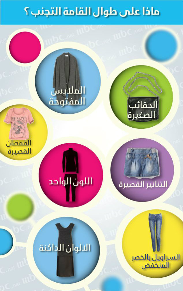 من السهل على طويلات القامة والنحيفات إتباع الموضة والظهور بشكل حسن إذا إبتعدن عن بعض الامور البسيطة، إذ توجد أساليب تساعد على إنقاص بضعة سنتيمترات ظاهريا من طول المرأة، وهناك بعض الامور التي تجهليها وتساعد على إظهارك بشكل أطول مما أنت عليه بطريقة غير جذابة، لذلك عليك تجنب بعض الامور إذا كنت من أصحاب القوام الفارع.