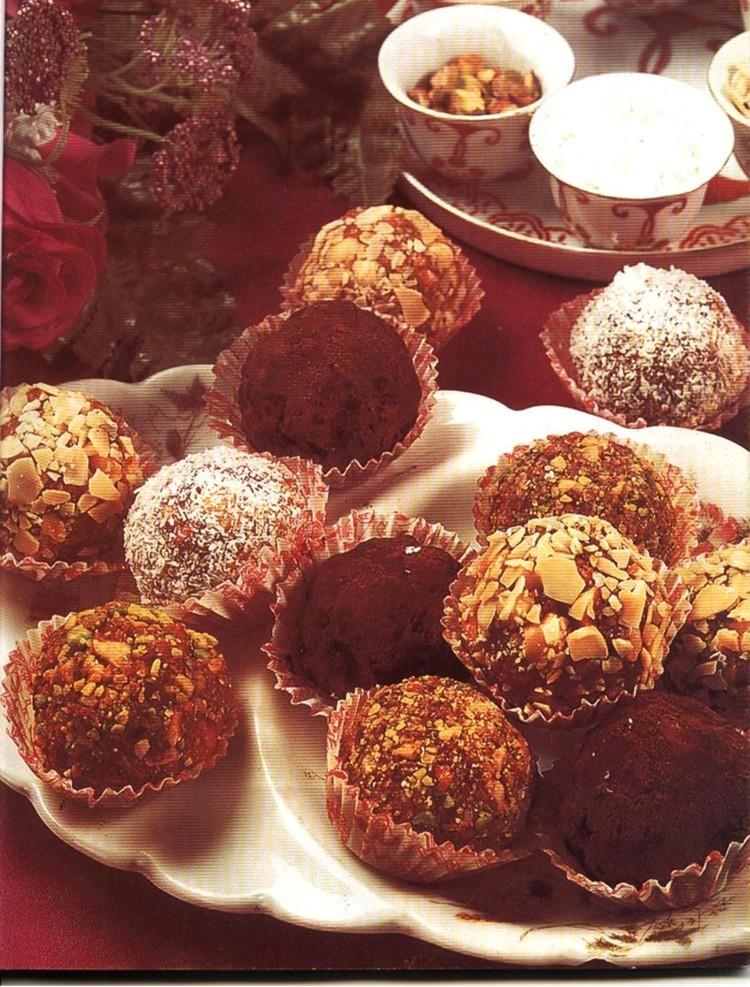 لكل من له أهتمام بهذا المجال إخترت لكم هذه الباقة من الحلويات الجزائرية التقليدية كرات الفستق http://up.azyya.com/do.php?imgf=1381737908091.jpg المقادير 250غ شكلاطة 2ملاعق كبيرة من العسل 130غ من الزبدة 3 ملاعق كبيرة حليب 250 غ طحين 2 بيض 150 غ سكر ملعقة كبيرة فنيليا 250 غ بندق مطحون خشن 60 غ جوز الهند طريقة التحضير ناخد طاسة و نضع في حمام مائي و نضع فيها الشكلاته و العسل و الحليب و الزبدة و نخلط جيدا و بعدها من دون التوقف عن التحريك نضيف البيض و ننزعها من النار ناخذ ايناء و نضع فيه الطحين مع البندق و الفانيليا و جوز الهند و السكر ثم نسكب الخليط الاول لتتماسك العجينة و بعدها نكون كرات صغيرة و نقوم بترميده في جززو هند و شوية بندق مطحون او لوز نضعها في فرن متوسط مدة 30 دقيقة |