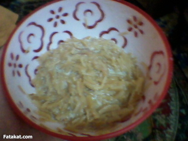 المكونات * 1 كوب شعريه * نص كوباية سكر * زبده او سمنه حسب الرغبه *رشة قرفه للتزين او زبيب حسب الرغبه * مقدار ميه * 2 كوب لبن * كيس فانليا الطريقه نحمر الشعريه فى السمنه انا استخدمت زبده على معلقة زيت علشان ماتبقاش تقيله نخليها بمبى منحمرهاش جامد قوى وبعدين ننزل بشويه ميه كده تاخد غلوة وبعدين انزلى باللبن والسكر والفانليا وسيبيها تاخد غلوة على الهادى كده مش هتاخد وقت خالص على النار وتقدميها فى الطبق وترشى على الوش قرفه او شوية زبيب حسب الرغبه او ساده دى طريقه الطريقه التانيه تسويها عادى خالص من غير لبن ولما تحتاجى سخنى لبن وصبى عليها بس انا لقيتها لما تستوى باللبن افضل واحلى والبنات خلصوها بسرعه والف هنا وشفا وادى صورتها ساده http://up.azyya.com/do.php?imgf=1382879045991.jpg ودى صورتها بالزبيب http://up.azyya.com/do.php?imgf=1382879179081.jpg :e049::e049::e049::e049::e049: :e049::e049: |