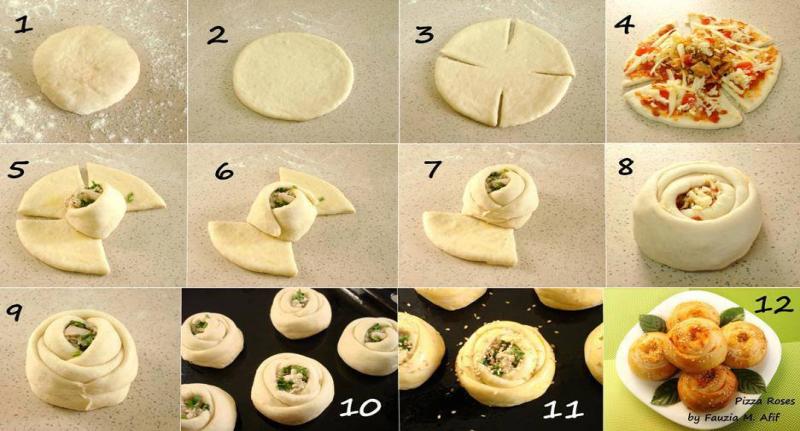 4 كوب دقيق ملعقة خميرة ملعقتين لبن بودرة ملعقة صغيرة ملح زيت 2 بيضة ملعقة سكر مطحون لحم مفروم مطهي بقدونس او سبانخ ماء دافئ طريقة التحضير في طبق غويط اخلطي الدقيق و الملح و السكر و اللبن و بيضة واحدة و الخميرة مع 4 ملاعق زيت و اضربيهم مع الماء الدافئ حتى يصل لقوام العجينه مثل عجينة العيش. اتركيها لترتاح ساعة واحدة قسمي العجينه ل 15 قطعة تقريبا و شكليها على شكل كور كل واحدة قطرها 4 سم تقريبا افرديها على شكر دائرة مسطحة و ادهنيها بقليل من الزيت اقطعي اربع شرط مثلما هو موضح في الصورة من دون الوصول لمنتصف الدائرة ضعي اللحم المفروم و البقدونس في المنتصف خذي ناحية من الاربع اجزاء و لفيها حول اللحم ثم كرريها في بقية الاربع اجزاء حتى تحصلي على شكل الوردة اضعطي على اطراف الوردة لاغلاقها ادهني الصينية بالزيت ثم ضعي فيها الورد ادهني كل وردة بالبيض المخفوق مع القليل من اللبن سخني الفرن على درجة حرارة 180 اخبزيهم في الفرن لمدة 15 ل 20 دقيقة ارفعي كل منها و ادهنيها بالذبد السايج يمكن اختيار الحشو المفضل لديكي بدل اللحم المفروم مثل الجبن او يغيره http://up.azyya.com/do.php?imgf=1384168596021.jpg ت ح ي ا ت ى:e027::e027::e027::e027::e027 ::e027::e027::e027::e027: |