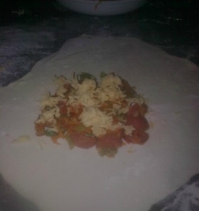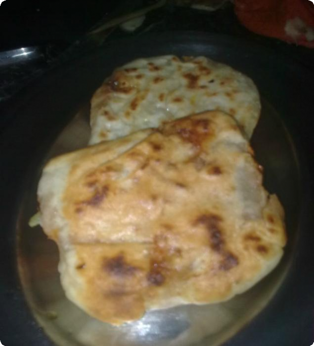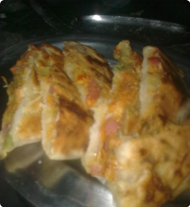 كوب دقيق نص كوب ماء رشة ملح للحشو جبنة شيدر مبشورة سوسيس فلقل اخضر طمطماية جزرة مبشورة ملح -فلفل-بهارات دى صورة للحشو http://up.azyya.com/do.php?imgf=1385631471931.jpg ودى الطمطماية قطعتها صغير وحطتها تتشوح على النار http://up.azyya.com/do.php?imgf=1385631472442.jpg وهنا ضيفت عليها السوسيس بعد محطيته فى ماء مغلى 10 دقايق وقطعته http://up.azyya.com/do.php?imgf=1385631472973.jpg ضيفت عليه الملح والفلفل والبهارات مش كتير رشة من كل حاجة وقلبته وضيفت عليه الفلفل الاخضر والجزر المبشور http://up.azyya.com/do.php?imgf=1385631473474.jpg وقلبت شوية صغيرة وضيفت حبة ماء صغيرين ولما اتشربوا من بعض طفيت نيجى بقى للفطيرة نفسها نخلت الدقيق وضيفت عليه الملح والماء وعجنت وسيبتها ارتاحت شوية لحد محضرت الحشوة وقطعتها 3 اجزاء وبدأت افرد بالنشابة وسيبت النص سميك شوية وضيفت الحشوة فى النص بالشكل ده http://up.azyya.com/do.php?imgf=1385631473985.jpg وبعدين طبقتها كده http://up.azyya.com/do.php?imgf=138563147456.jpg وكده كمان مرة http://up.azyya.com/do.php?imgf=1385632054791.jpg وده شكلها لما خلصتهم كلهم http://up.azyya.com/do.php?imgf=1385632055332.jpg جيبت طاسه ودهنتها زيت خفيف وحطيت الفطيرة تستوى http://up.azyya.com/do.php?imgf=1385632055863.jpg احملرت قلبتها الناحية التانيه http://up.azyya.com/do.php?imgf=1385632057055.jpg الشكل النهائى الف هنا وشفا http://up.azyya.com/do.php?imgf=1385632057596.jpg التقييم تقديرا لتعبى يابنات |