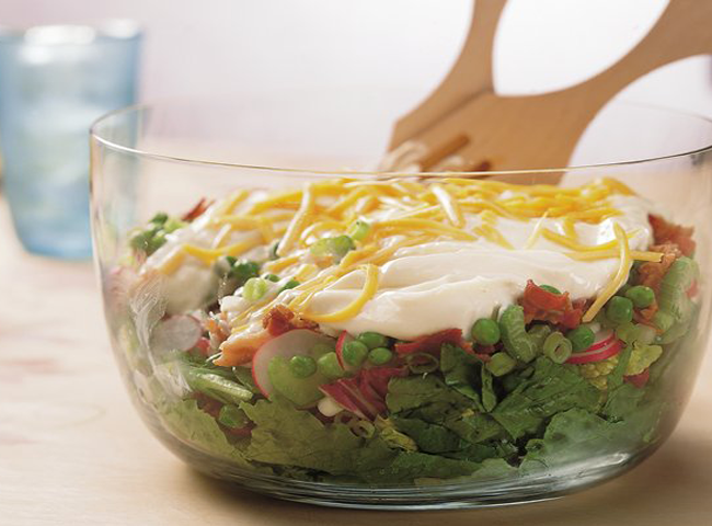المقادير : 6 كوب سلطة خضراء 8 حبات فجل مقطعة شرائح 8 حبات بصل أخضر منظف وقطع شرائح رفيعة 1 كوب سيقان كرفس امريكى مقطع شرائح رفيعة 12 شريحة لحم مرتديلا نصف كيس بازلاء مطهية بالبخار لطعم افضل نصف كوب مايونيز او دريسينج ايطالى ( متوفر بالموقع ) نصف كوب جبنة شيدر مبشورة طريقة التحضير : 1- ضعى السلطة الخضراء فى طبق عميق يليها طبقة فجل ثم طبقة بصل ، ثم سيقان الكرفس يليهم شرائح المرتديلا المقطعة ثم البازلاء 2- قومى باضافة المايونيز او الدريسينج الايطالى 3- واخيرا رشى الطبق بالجبنة 4- غطى السلطة واتركيها بالثلاجة حوالى ساعتين قبل التقديم |