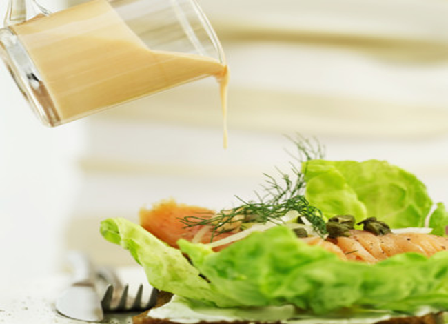المقادير : نصف كوب خردل 2 ملاعق كبيرة خل أحمر 1 أكواب زيت زيتون طريقة التحضير : 1- يخفق الخردل مع الخل جيداً 2- نبدأ فى إضافة الزيت بالتدريج 3- إذا إنفصل الخردل عن الزيت نضيف ملعقة كبيرة من الماء الساخن ونقلب جيداً 4- تستعمل هذه الصلصة مع سلطة الأنديف أو القوانص ويمكن إستخدامها مع اللحوم |