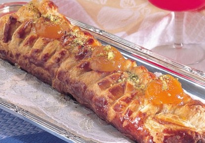 المقادير عجينة الباف باستري الجاهزة , علبة لوز مطحون ,3 كوب زبيب ,0.5 كوب مشمش مجفف ,0.5 كوب سكر , كوب فانيليا ,0.5 ملعقة صغيرة طحين , كوب صفار بيض , حبة مربى مشمش ,3 ملعقة كبيرة ثمار مشمش ,3 حبة فستق مطحون , للزينة طريقة التحضير - ينقع المشمش المجفف في الماء لمدة نصف ساعة ثم يقطع. - ينثر الدقيق (الطحين) على الطاولة المعدة لصنع الحلوى وتحضّر عجينة مستطيلة الشكل طولها 35 الى 38 سم وعرضها 15 سم. - تقطّع خطوط بعرض 1.5 سم على جانبي العجينة. - يمزج السكّر مع اللوز والزبيب والمشمش المقطع والفانيلا. - يبسط المزيج في وسط العجينة وتطوى جوانبها بحيث تتشابك على شكل ضفائر. - تمسح صينية للخبز غير قابلة للالتصاق بالماء. - تبسط العجينة في الصينية ويدهن وجهها بصفار البيض. - تخبز العجينة في فرن محمى مسبقاً الى حرارة 375 درجة فهرنهايت لفترة 15 دقيقة. - من ثم تخفّض حرارة الفرن الى 350 درجة فهرنهايت وتبقى العجينة داخل الفرن الى أن تصبح منتفخة وذهبية اللون. - تترك الفطيرة في الفرن المغلق لفترة 20 الى 25 دقيقة. - بعدها تخرج الفطيرة من الفرن ويدهن سطحها بمربى المشمش، ومن ثم ينثر عليها الفستق المطحون وتزيّن بقطع المشمش. |