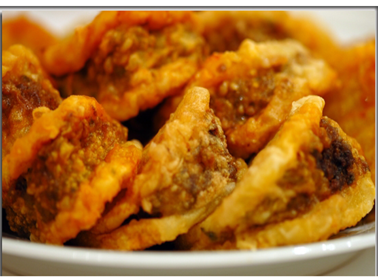المقادير : - 6 حبات من البطاطا الكبيره - ½ كيلو جرام من اللحم المفروم - 1 بصله كبيره مفرومه ناعما - 2 بيضه - 1 كوب من البقدونس المفروم - 2 ملعقه كبيره من الجبن الرومى المبشور - 1 ملعقه صغيره من البهارات - ½ كوب من البقسماط ( فتات الخبز ) - ملح وفلفل - 1 ملعقه كبيره من البقسماط حسب الحاجه - زيت للتحمير طريقة التحضير : - يسخن الفرن على حراره 180 درجه - تسلق البطاطا وتقشر وتقسم بالطول الى نصفين ( يمكن ان تجوف قليلا) - يخلط اللحم والبصل والبيضة والجبن المبشور والبقسماط والبقدونس والملح والفلفل والبهارات جيدا - يكور الحشو وتحشى البطاطا مع الضغط الخفيف حتى يتماسك الحشو مع البطاطا - تغطى حبات البطاطا المحشوة بالدقيق ثم البيض ثم البقسماط - تحمر البطاطا المحشوة فى قليل من الزيت حتى تتلون ثم توضع فى صينية فى الفرن حتى تمام النضج - تقدم ساخنة او باردة مع سلطة خضار او الصلصة المفضلة |