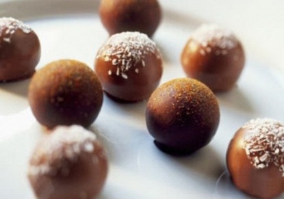 المقادير شوكولا بيضاء سائلة للتقديم, حسب الرغبة دقيق بقسماط أبيض (فتات خبز) ,1.25 كوب شوكولا غامقة سائلة,0.50 كوب جبن مسكربون ,0.50 كوب بيض مخفوق ,2 حبة لوز مطحون,1.25 كوب صلصة التوت للتقديم, حسب الرغبة طريقة التحضير - تُخلط الشكولاتة والجبن جيداً، في وعاء عميق حتى تتداخل المكونات، يُترك الخليط ليبرد قليلاً. - يُخلط اللوز والبقسماط في طبق كبير. - يُشكل خليط الشكولاتة على هيئة كرات وتوضع في البيض المخفوق. - تُدحرج الكرات في خليط البقسماط حتى يُغطيه (مع التخلص من البقسماط الزائد). - تُحمر كرات الشكولاتة في الزيت الساخن، حتى تُصبح ذهبية اللون، وتُرفع على منشفة ورقية لامتصاص الزيت الزائد. - يُوزع قليل من الشكولاتة البيضاء في طبق التقديم، تُرص كرات الشكولاتة. - تُقدم دافئة مع صلصة التوت. |