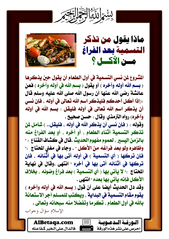 ماذا يقول من تذكر التسمية بعد الفراغ من الأكل