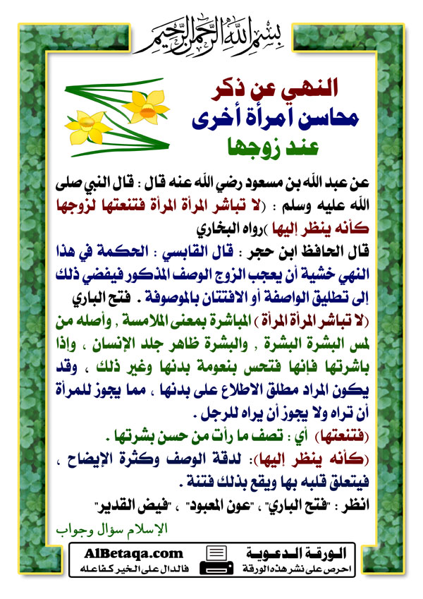 رد: النهي عن ذكر محاسن امرأة أخرى عند زوجها
