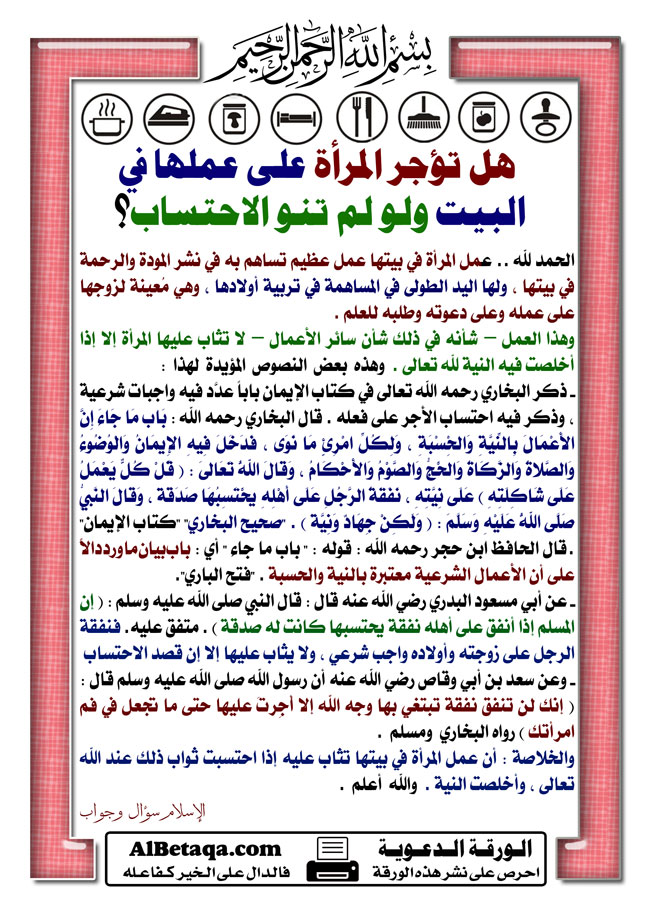 هل تؤجر المرأة على عملها في البيت ولو لم تنو الاحتساب؟