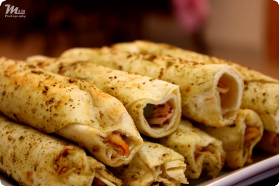 المقادير: دجّاج مقطع قطع صغيره , خبز تورتيلا , زيتون آخضر منزوع النوى , بهارات , 1بصل مفروم , كاس زيت زيتون , زعتر , فلفل آحمر , ثوم مهروس الطريقه: - تسلقين الدجاج بعد ما ينضج تضعين عليه : بهارات , بصل مفروم , فلفل أحمر , ثوم مهروس , زعتر , [نخلط الزيت زيتون , زعتر ] - ندهن الخبز بـخليط الزيت زيتون و الزعتر , تحشى بالدجّاج ثم تُلف وتدهن بزيت الزيتون والزعتر , تغلف كل حبه بالقصدير وتحمر قليلاً بالفرن , يفتح القصدير وتقدم ساخنه |